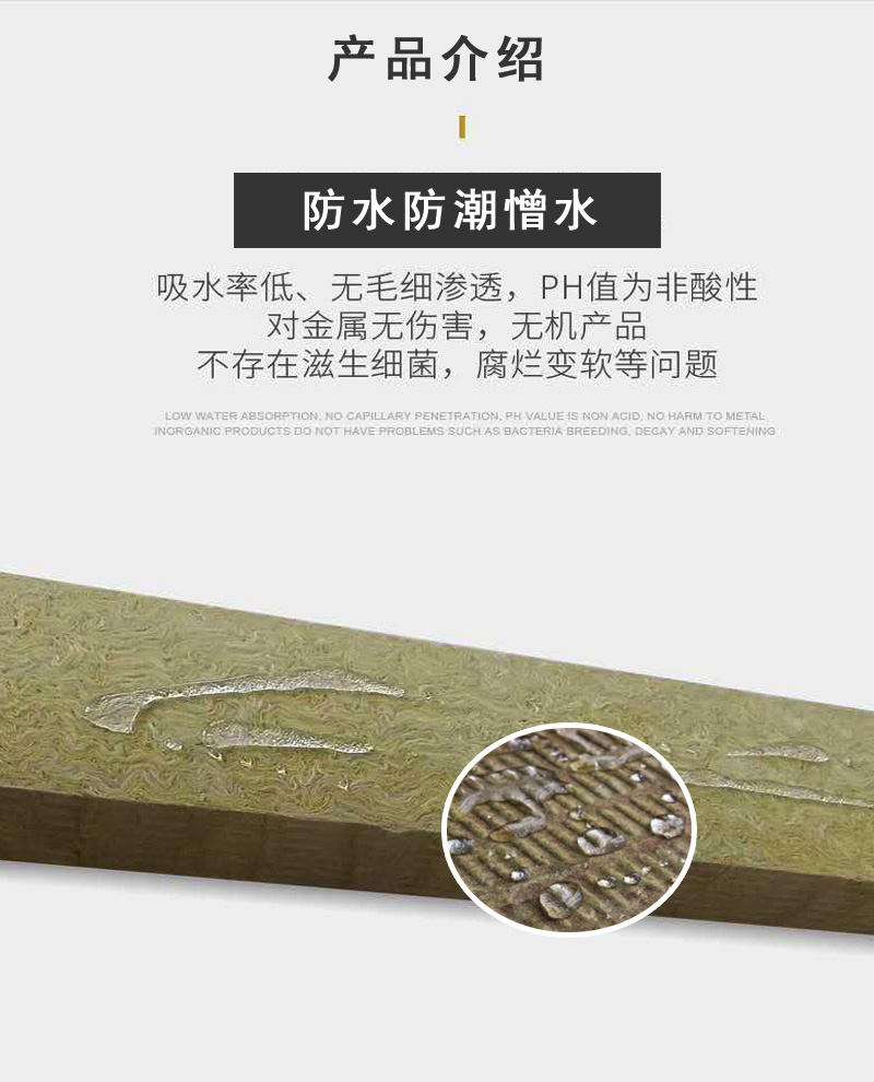 憎水巖棉產品憎水率可達到99.9%;吸水率極低,無毛細滲透。